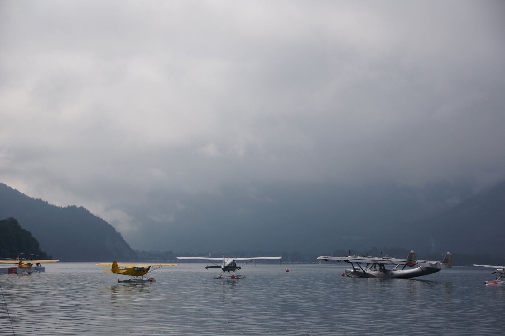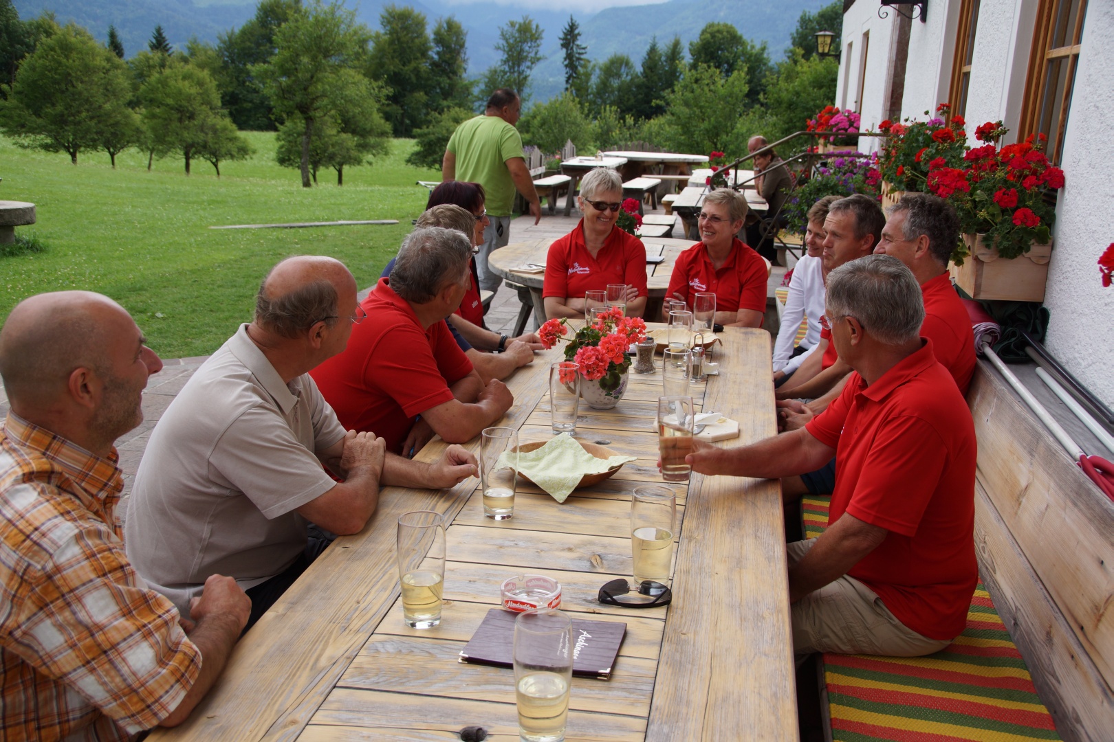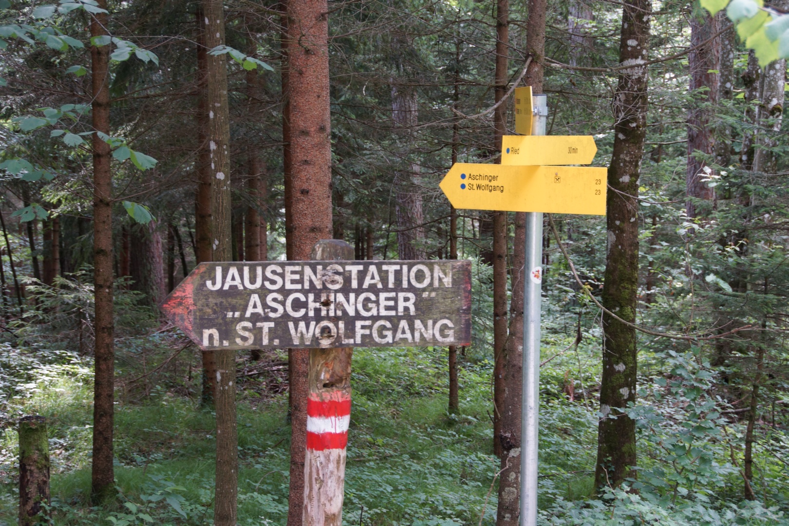 Wanderer und Zugfahrer haben sich dann unter der Nebel/Wolkenschicht bei der Jausenstaton Aschinger (wunderbare Lage etwas oberhalb von St. Wolfgang, freundlich und sehr guter Most) wieder getroffen.