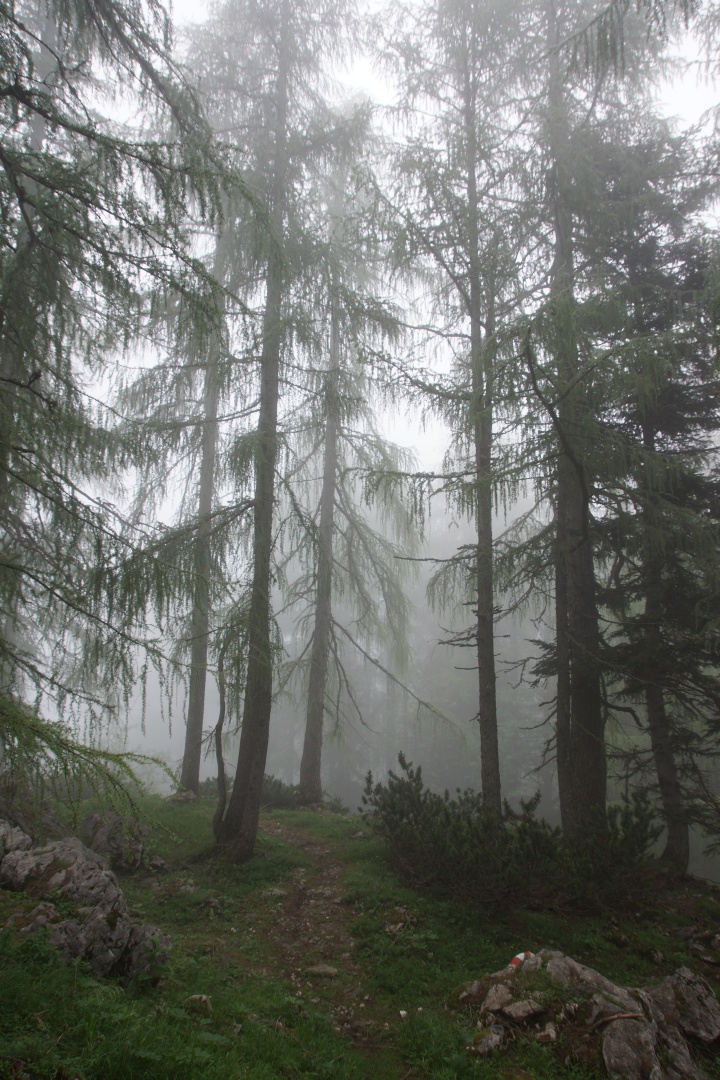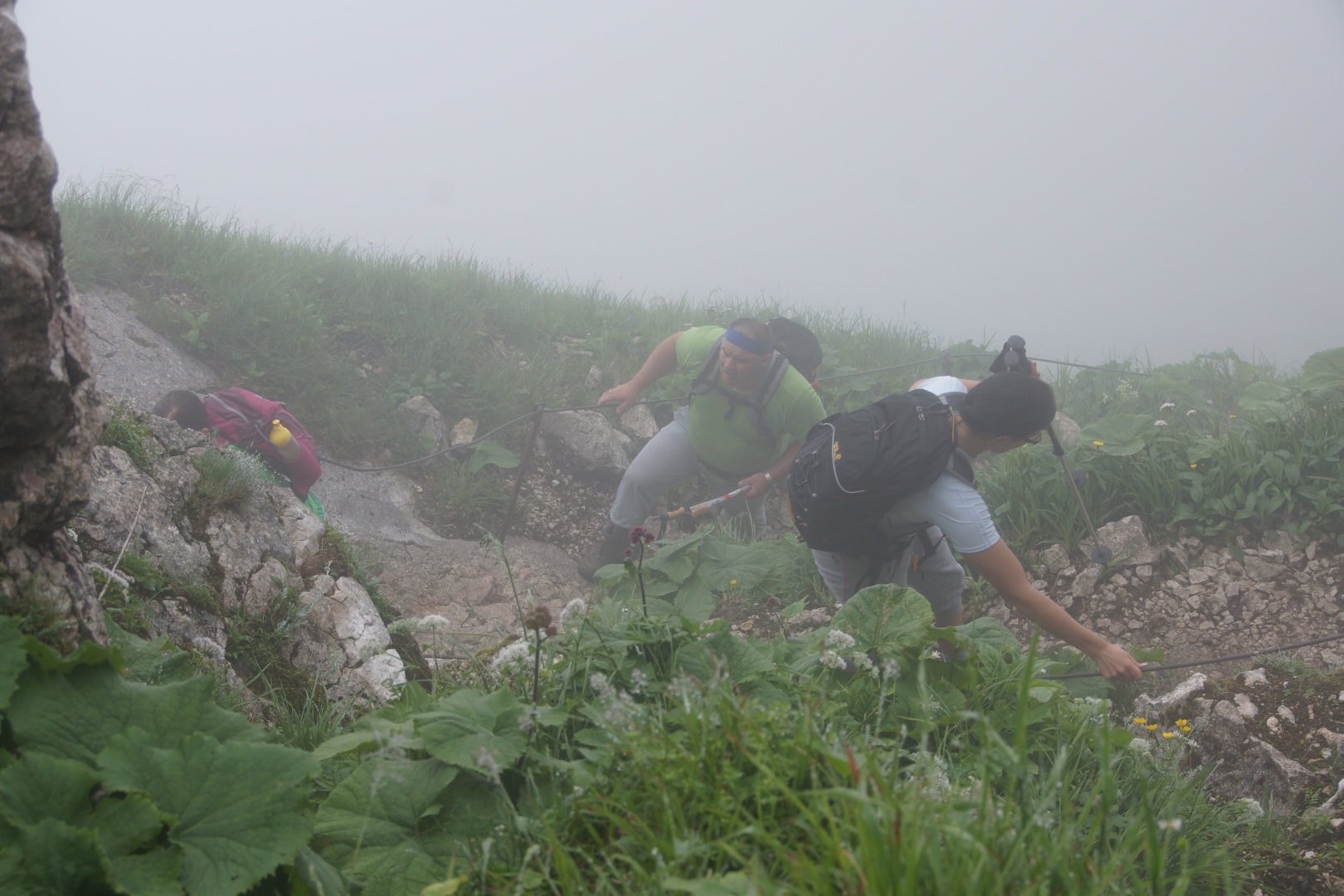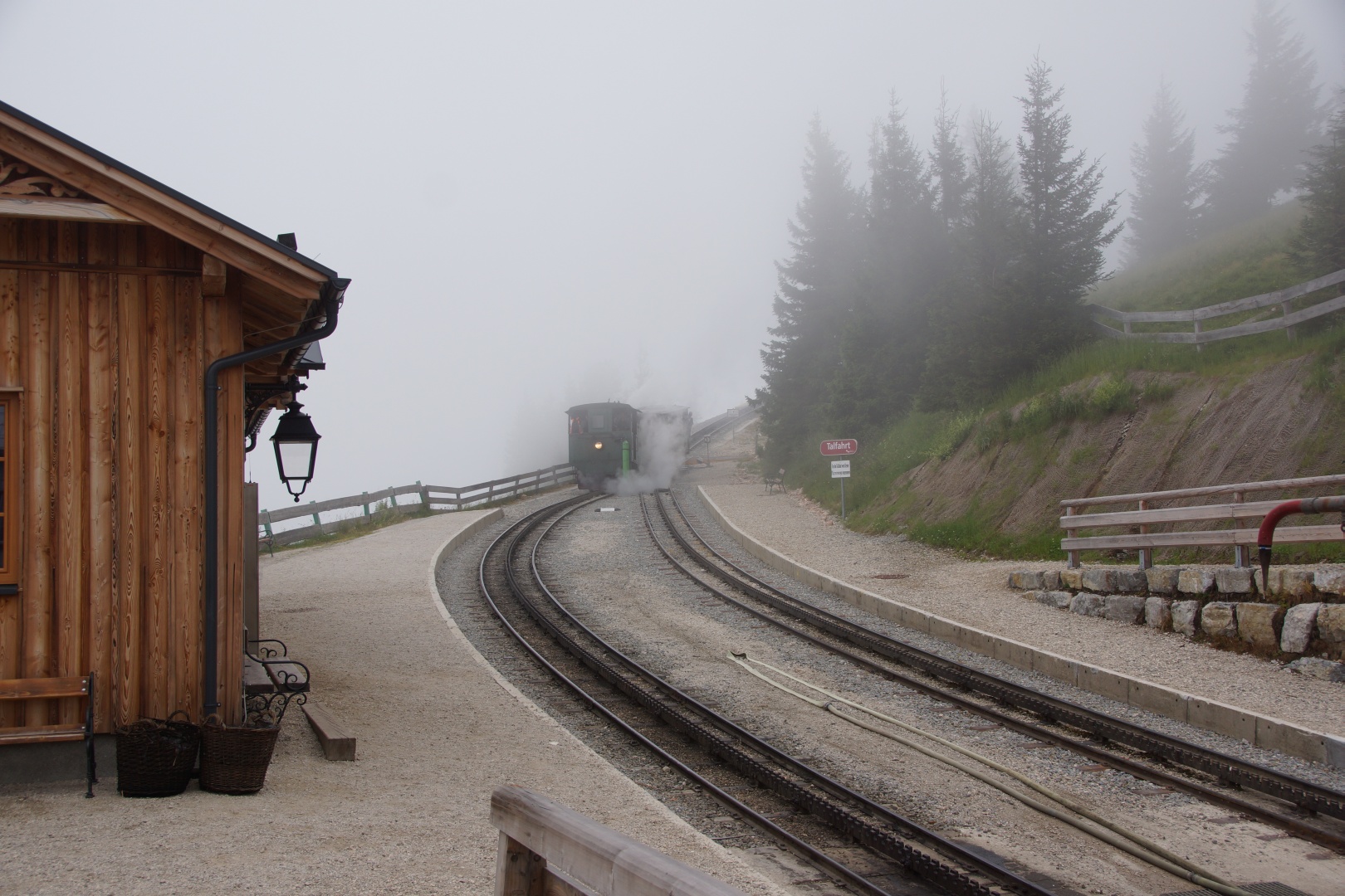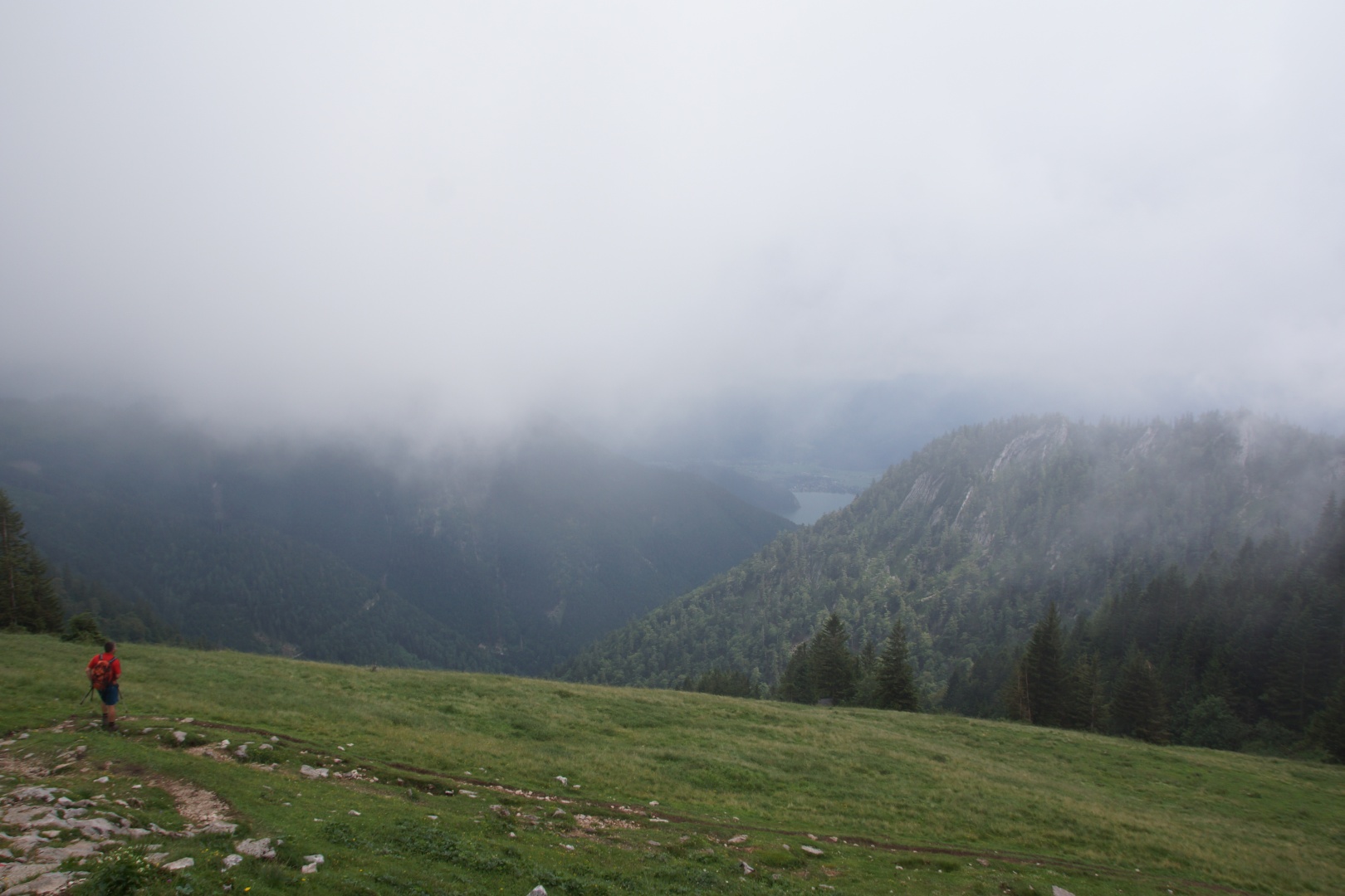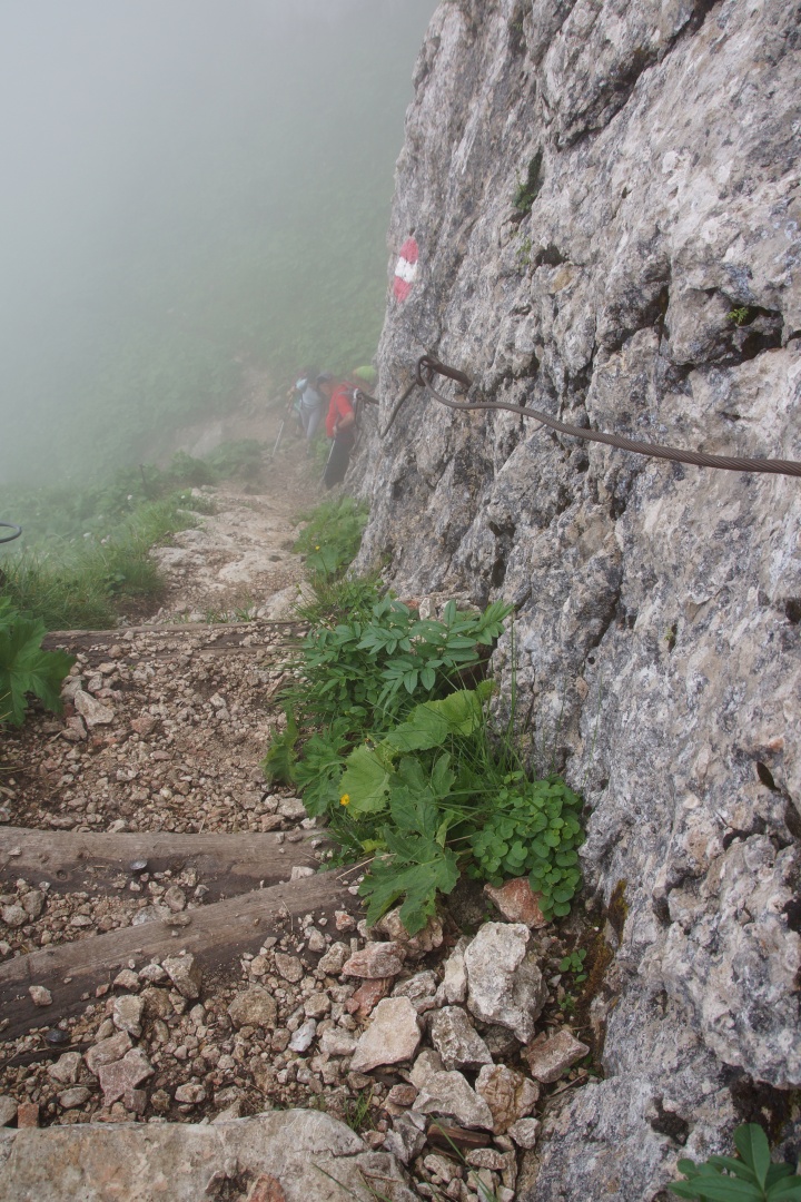 Die vom Wetterbericht vorhergesagten Regenschauer sind zwar ausgeblieben, allerdings war auch von der versprochenen Sonne nichts zu sehen. Wir sind fast den gesamten Weg im dichten Nebel gegangen. Zumindest war es nicht heiß, aber etwas Aussicht hätten wir uns verdient. Eine kleine Gruppe hat die Fahrt mit der Schafbergbahn ausgelassen und ist ins Tal gewandert.