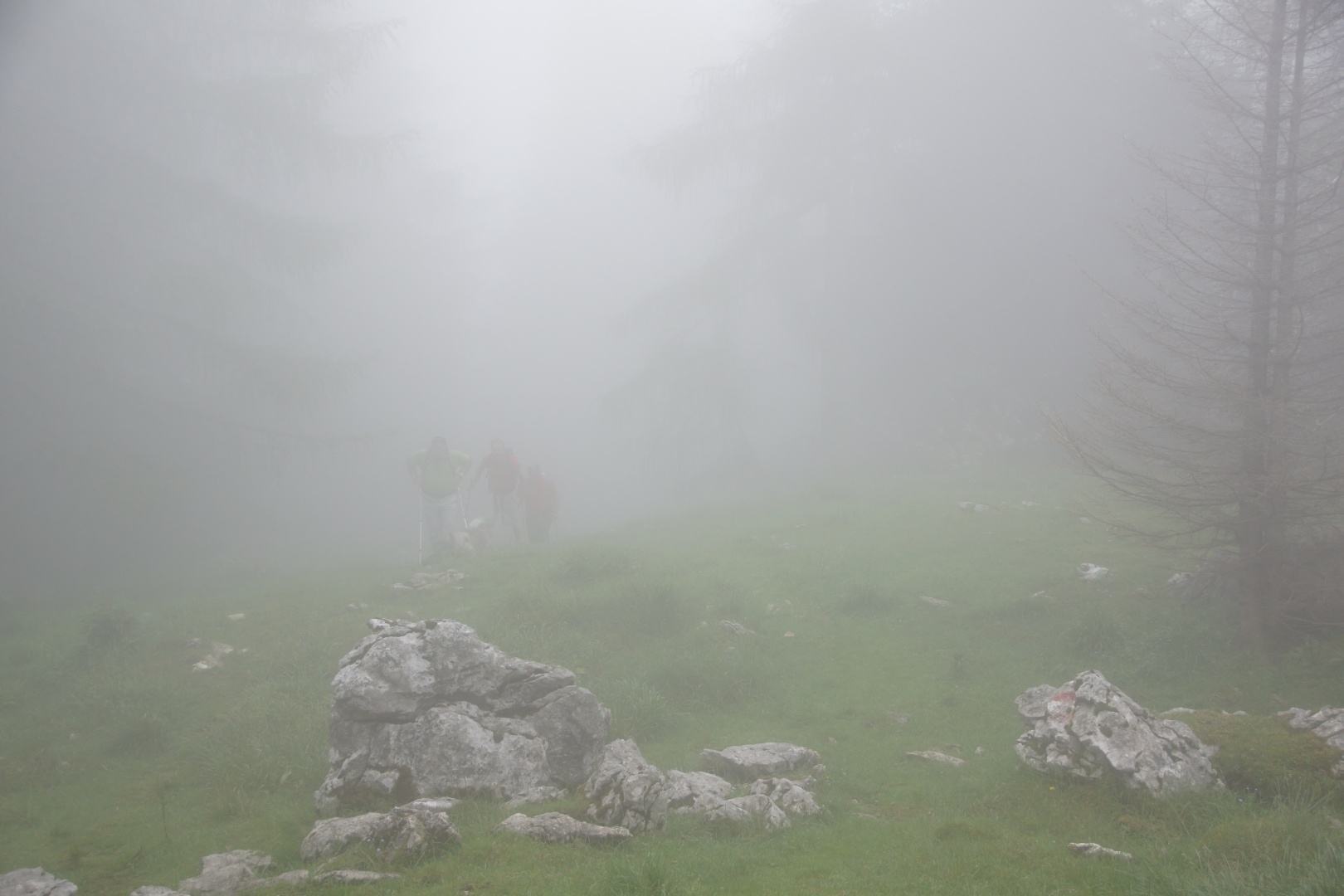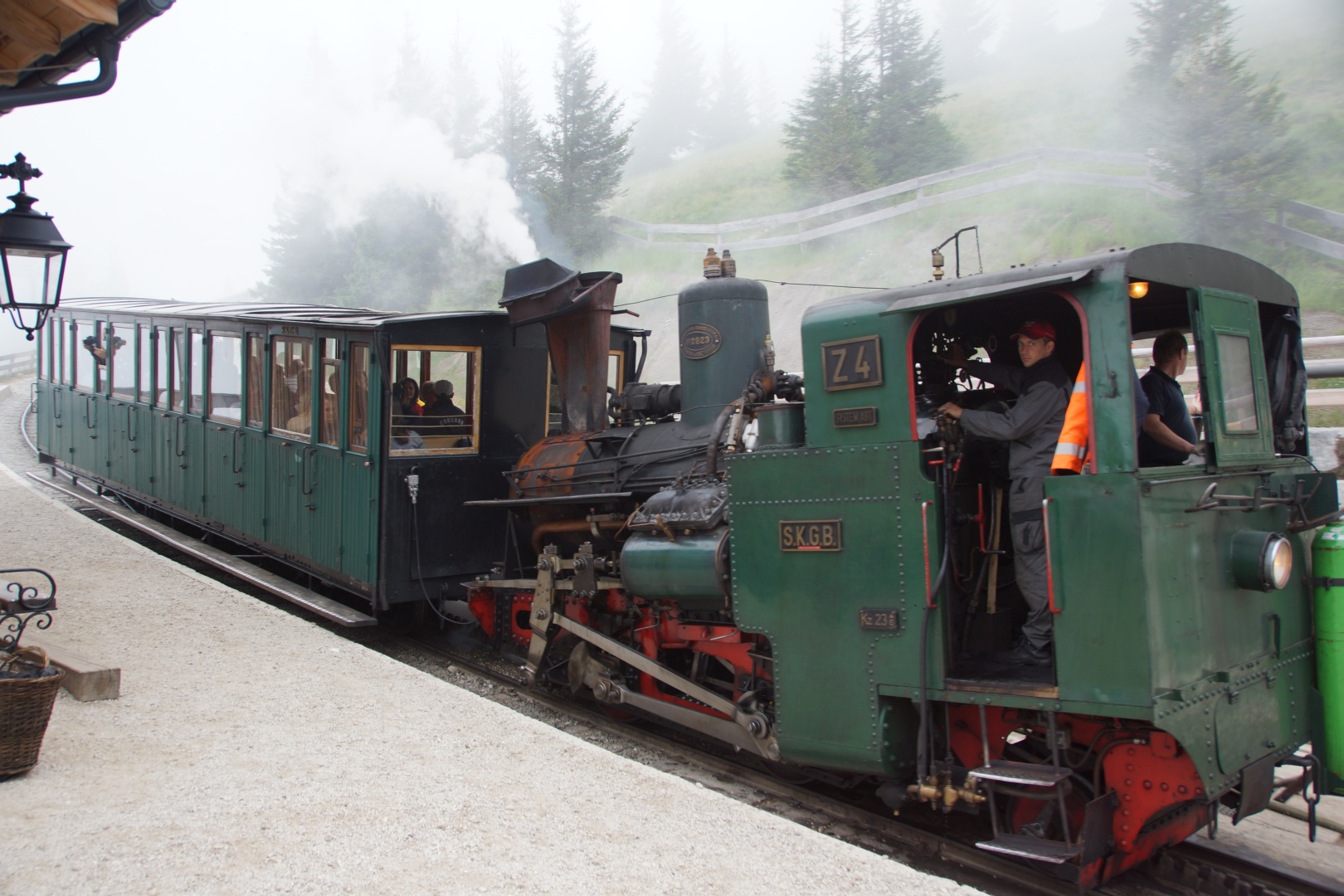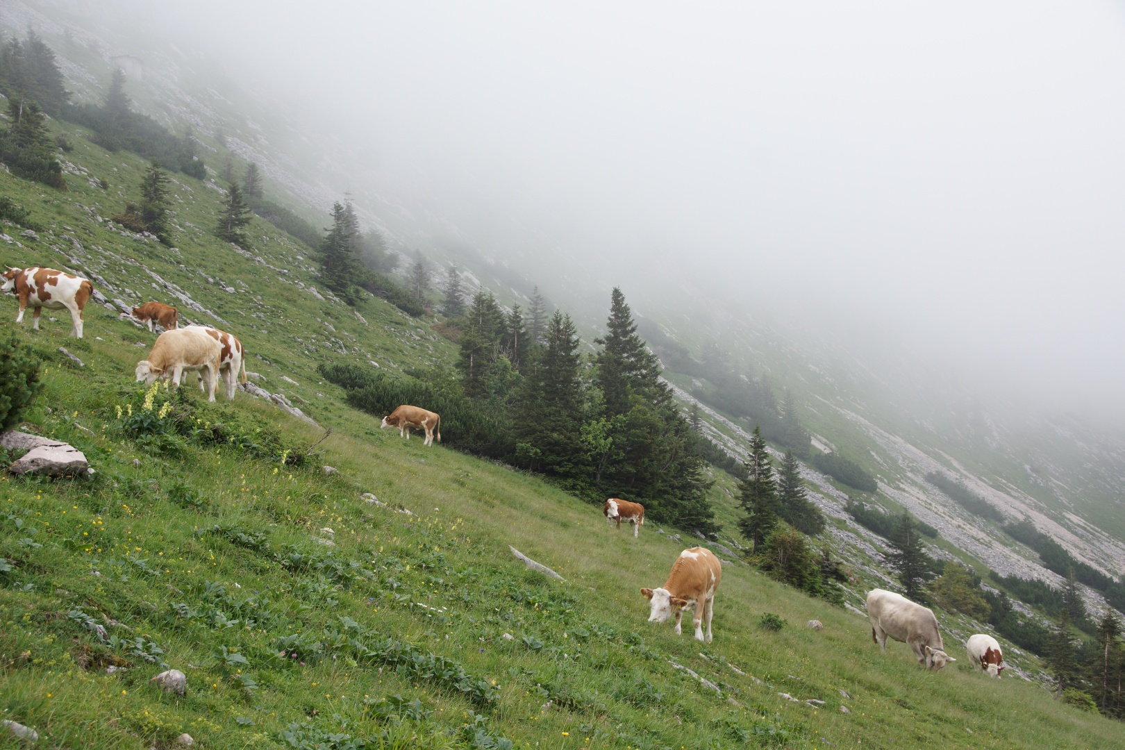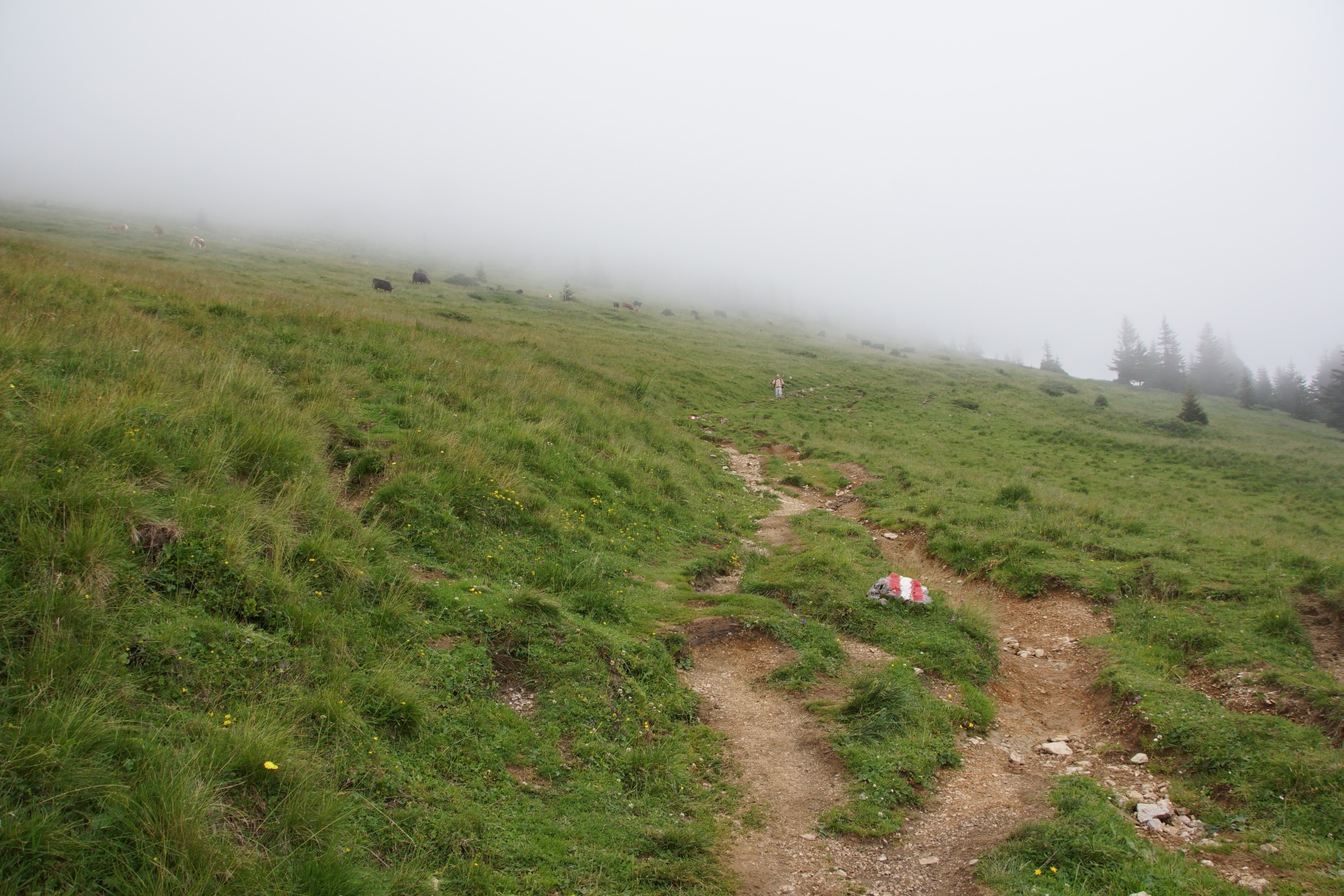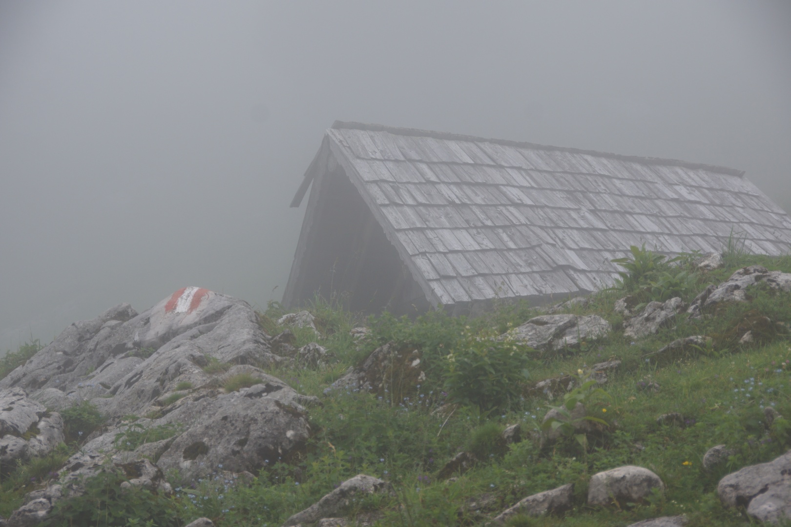 Die vom Wetterbericht vorhergesagten Regenschauer sind zwar ausgeblieben, allerdings war auch von der versprochenen Sonne nichts zu sehen. Wir sind fast den gesamten Weg im dichten Nebel gegangen. Zumindest war es nicht heiß, aber etwas Aussicht hätten wir uns verdient. Eine kleine Gruppe hat die Fahrt mit der Schafbergbahn ausgelassen und ist ins Tal gewandert.