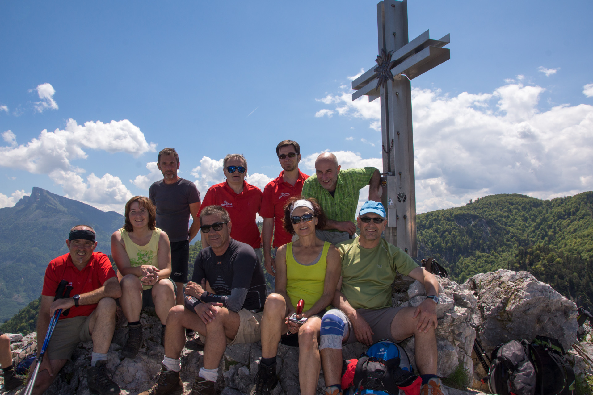 Während die Kletterer von Ernst auf der richtigen Route zum Gipfel geführt wurden, haben die Wanderer einen kleinen Umweg eingelegt. Ein sehr hilfreicher Förster zeigte den Wanderern aber nicht nur den richtigen Weg, sondern nahm sie sogar ein Stück mit dem Auto mit. So konnten alle gemeinsam das Gipfelbier genießen.