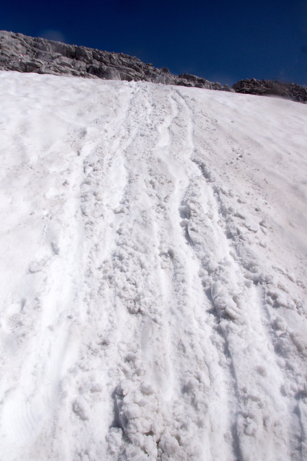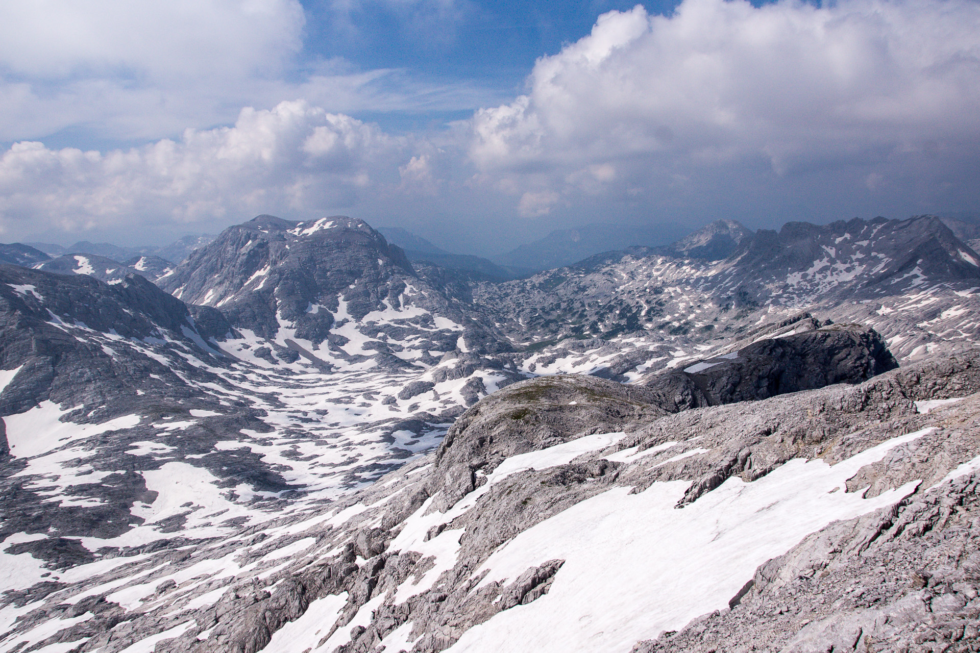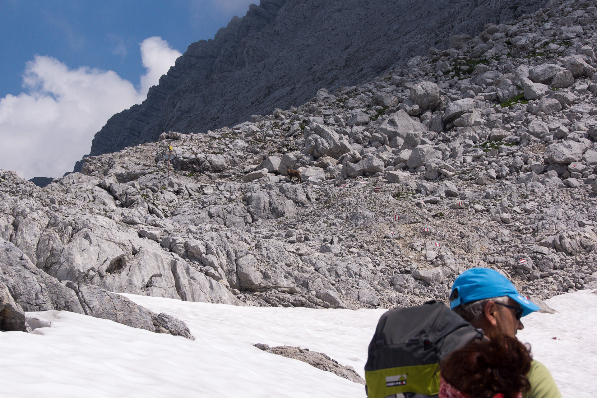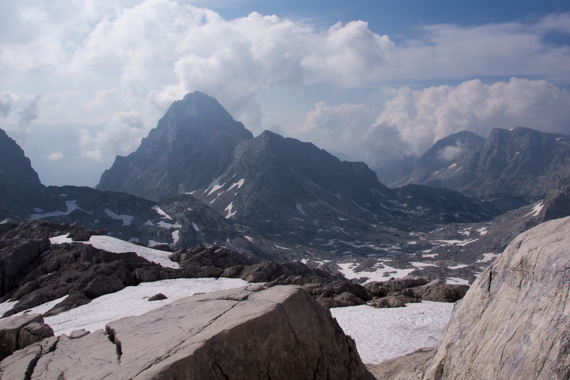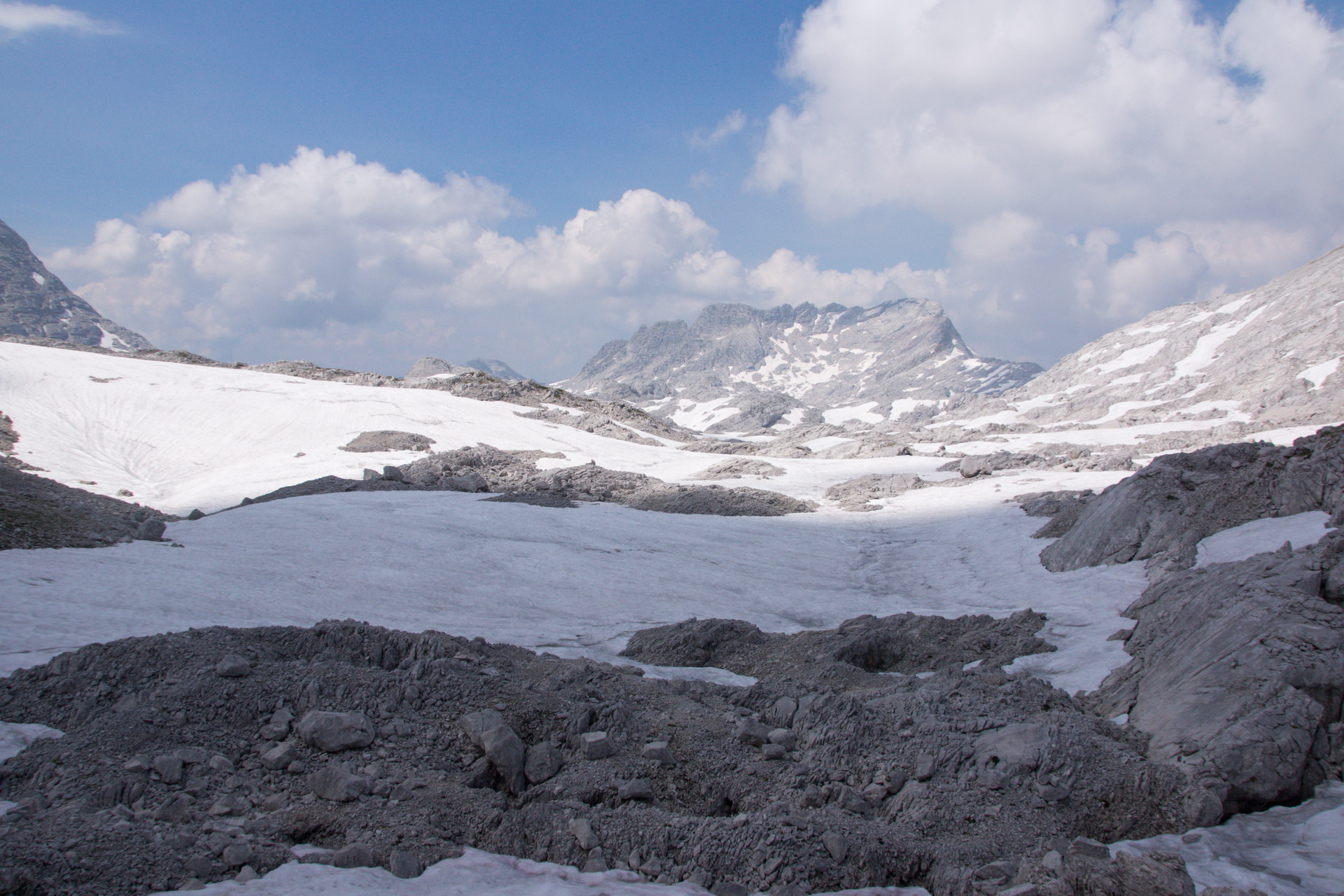 Für den Abstieg wählten wir einen wegen "außen herum" um die steilen Schneefelder zu meiden. Ein paar harmlose Wolken schützten uns vor der prallen Sonne.