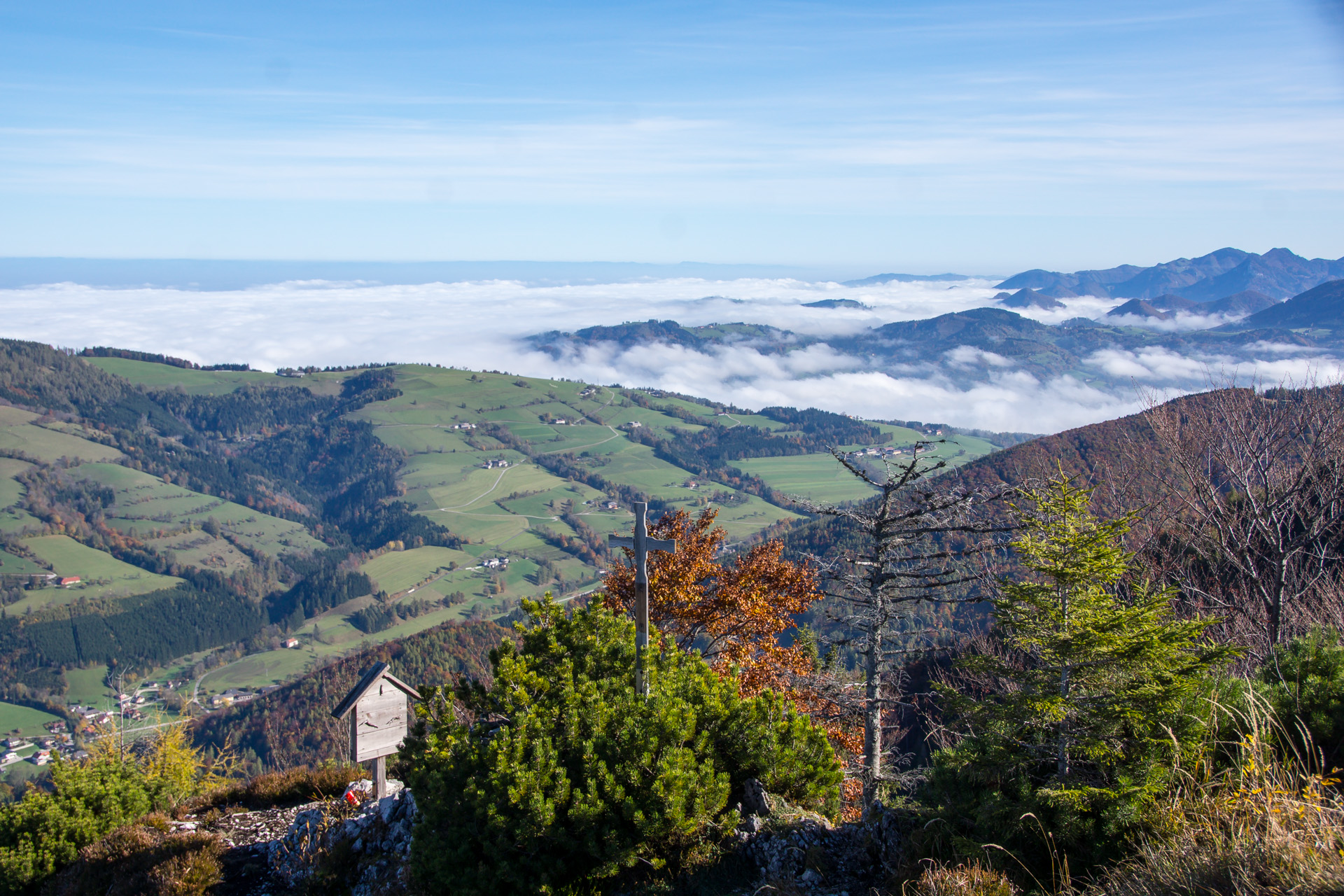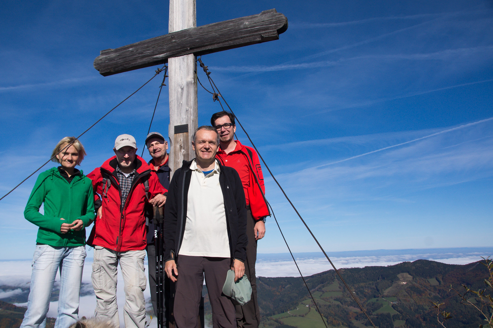 5 Wanderer (plus 1 Hund) haben diesen wunderschönen Tag für eine kleine Bergtour genutzt. Der Weg führte durch bunte Herbstwälder stetig zum Gipfel von wo sich ein wunderbares Panorama bietet. Der Blick geht im Norden bis zum Böhmerwald und zeigt auch in den anderen Himmelsrichtungen bekannte Berge aus einer neuen Perspektive.